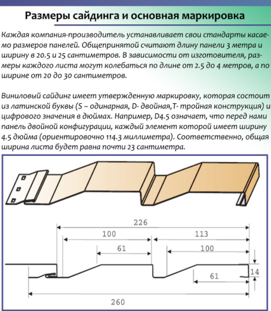 Les produits en plastique trop fins peuvent se fissurer en hiver sous le gel. Le matériau s'apprécie non seulement par son épaisseur, mais aussi par la composition de la matière première, ses paramètres chimiques ; le nombre de modificateurs (additifs) compte. Le revêtement de vinyle imite les bûches, les planches de bois, la brique, la pierre et d'autres matériaux.