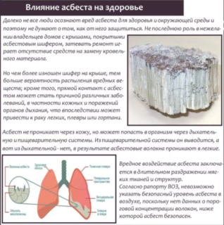La présence d'amiante dans l'ardoise est vraiment peut provoquer une réaction négative sujet à ingestion. Cependant, les fibres utilisées dans la production se répartissent en deux catégories - arysotile et amphibole. L'ardoise amphibole a un effet nocif sur la santé humaine. Cependant, il n'est utilisé en mélange qu'en Europe en l'absence de la première substance dans le domaine public. De cette façon, Le matériau de toiture de fabrication russe est sûr.