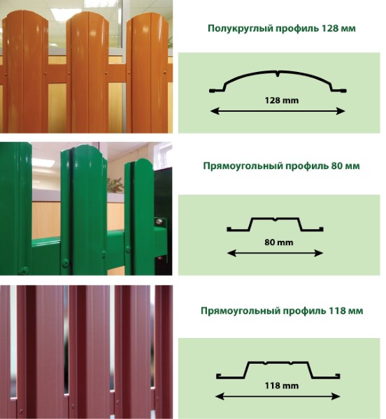 L'épaisseur de la tôle utilisée pour les produits varie de 0,4 à 1,5 mm. Les options minces (0,4-0,5 mm) sont les plus courantes. Si on parle de fabrication indépendante d'une palissade, ce sont ces produits qui sont les plus traumatisants. La largeur des bandes en vente est de 8 à 13 cm.Leurs couleurs peuvent être très différentes, il ne sera pas difficile de choisir une palissade colorée qui convient à la solution de conception du site et du bâtiment.