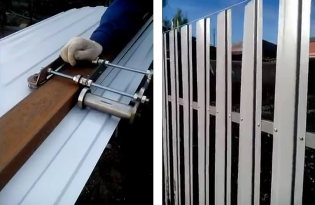 En plaçant la tôle profilée sur l'établi et en la fixant, tracez une ligne de marquage le long d'une règle au milieu d'une vague étroite. Une barre est coupée le long de celle-ci, déplaçant l'outil en douceur à la même vitesse. La procédure est répétée jusqu'à ce que la feuille soit divisée en piquets. Les bords des éléments sont roulés sur une machine spéciale.
