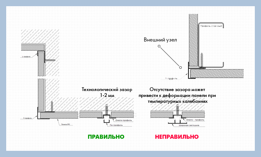 L'installation de LSU face aux murs, aux plafonds, la fabrication de cloisons à l'intérieur de la maison est effectuée sur un profilé métallique... Lorsqu'il est utilisé pour le cadre d'une poutre en bois entre les feuilles de revêtement, laissez écart thermique de quelques mm... Le même écart est choisi lors de l'utilisation de matériel d'extérieur, quel que soit le type de cadre.