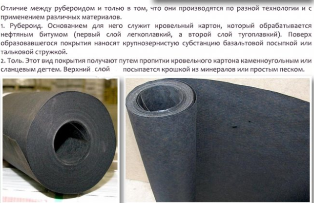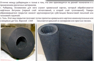La différence détermine la composition utilisée pour imprégner les feuilles. Pour la fabrication de matériaux de toiture, au lieu de mélanges avec du goudron, du bitume liquide est utilisé. Le produit est plus fort et dure plus longtemps.
