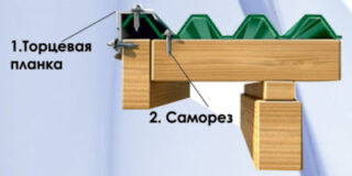 Les plaques d'extrémité sont installées après la pose du matériau de couverture sur le toit. Les produits sont placés sur des tuiles avec chevauchement en une seule vague. Les valeurs de chevauchement autorisées sont ici supérieures à celles du cas précédent : les bandes peuvent être superposées les unes sur les autres de plus de 0,5 m. Le pas entre les vis autotaraudeuses, comme pour les produits de corniche, est de 0,4 à 0,5 m.