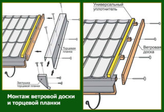 Les couvertures de toit avec un grand nombre de joints ont particulièrement besoin d'une protection contre l'humidité. À cette fin, par exemple, une planche à vent pour carreaux métalliques est utilisée. Il a la forme d'un coin en forme de lettre "G", dont l'une des étagères est fixée au cadre de lattage. L'autre côté est responsable de la protection du porte-à-faux. Souvent, avec la bande, un joint est installé qui répète les lignes de la maçonnerie en carreaux. Les ventouses sont utilisées non seulement pour la disposition des toits en tuiles, mais également pour le travail avec d'autres matériaux de toiture métalliques (y compris les tôles profilées) et d'autres types de matières premières (par exemple, l'ardoise).