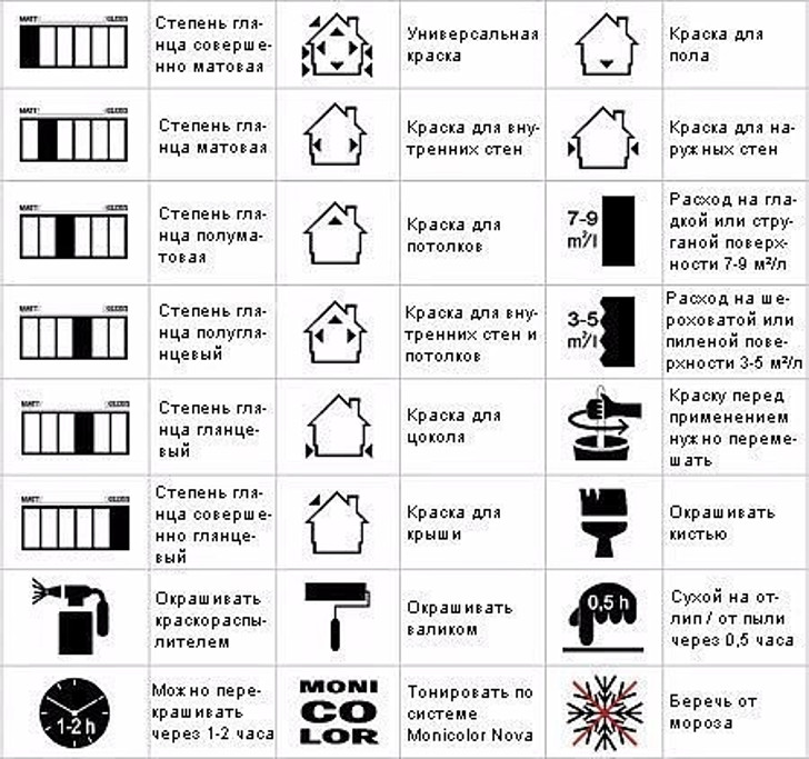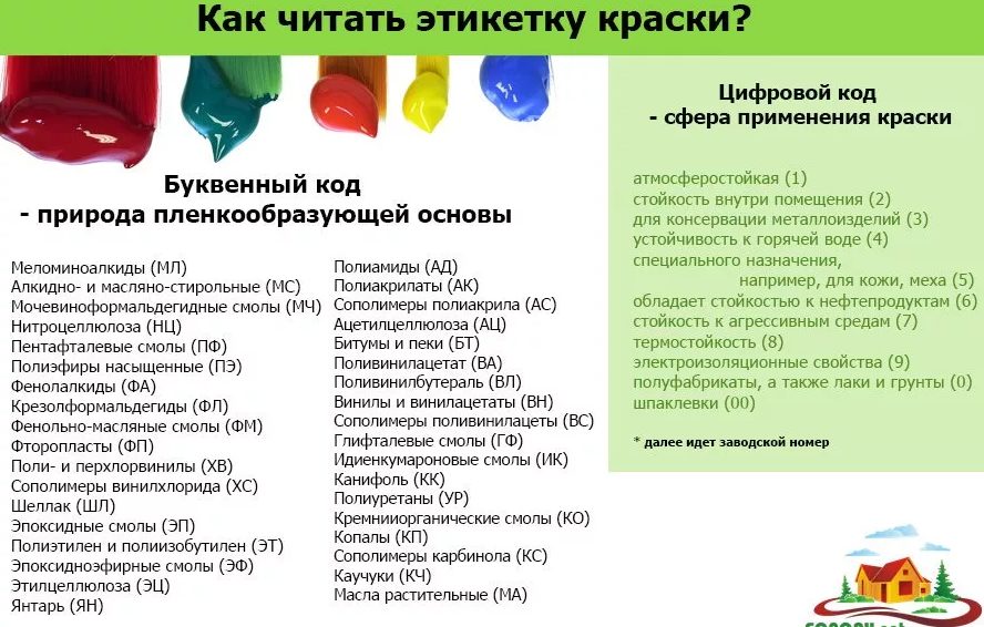 Doit être indiqué type de peinture - acrylique, huile, alkyde, caoutchouc et autres. Il vaut la peine de prêter attention caractéristiques du produit - conditions de séchage recommandées (chaud ou froid), degré de brillance, inflammabilité, viscosité.