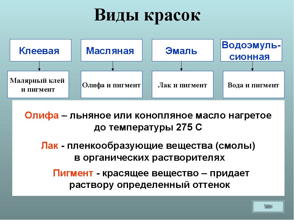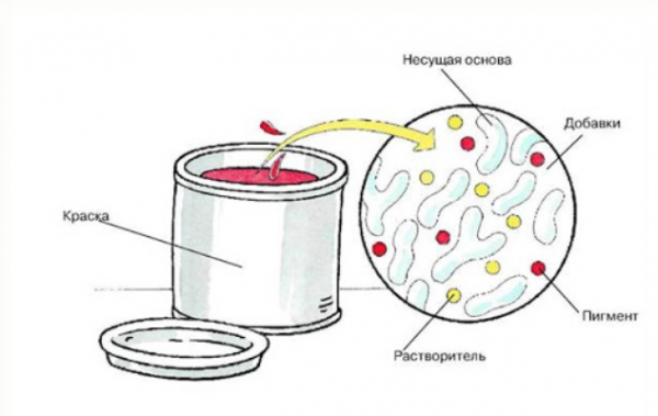 Le composant le plus important qui détermine les propriétés physico-chimiques de la peinture est le liant. Le filmogène est à base d'huile siccative naturelle ou synthétique, de minéraux, de résines, de polymères.