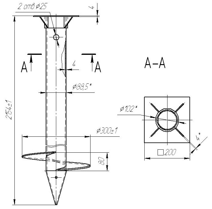 - Lame en acier au carbone d'une épaisseur de 5-6 mm. Son diamètre intérieur est égal à la circonférence du tuyau et le diamètre extérieur est choisi comme suit: pour un tronc d'une section de 6 cm, il est égal à 20 cm, pour un tas de 7,5 à 9 cm - 25 cm, pour une tige de 11 cm - 30 cm. Le pas de vis est généralement de 20 -40% du diamètre extérieur. Plus le sol est fin et meuble, plus la valeur est valorisée.