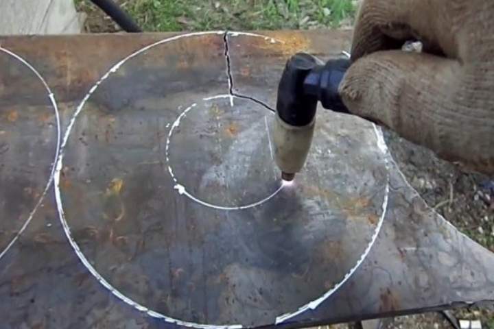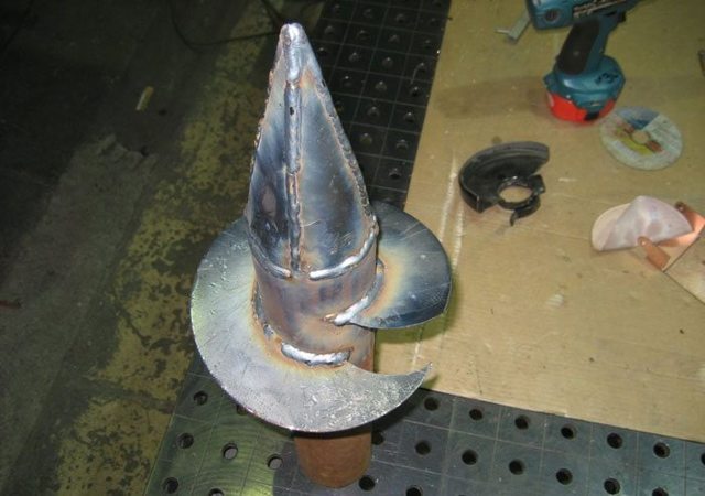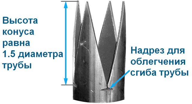 - Le cône est fait tétraédrique: à l'extrémité du tuyau, des segments sont coupés, pliés au marteau et soudés. Le balisage peut être réalisé à partir de patrons en papier.
