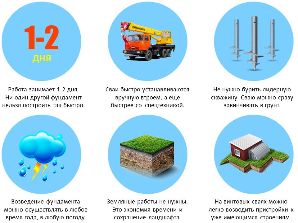 Les pieux vissés pour la fondation sont attrayants en raison de la rapidité d'installation, ainsi que de la possibilité de les utiliser dans des zones à forte montée des eaux souterraines. Cependant, sur certains types de sols, de tels supports ne peuvent pas être installés. Lors de l'aménagement de la fondation, il est important de réaliser une étude géologique de la zone et de sélectionner des produits d'une épaisseur de paroi suffisante ayant subi un traitement anti-corrosion.