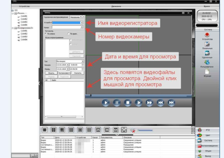 Lors du visionnage de vidéos, grâce au CMS, il est possible de sortir simultanément plusieurs canaux à la fois à partir de chaque appareil d'enregistrement, ce qui réduit le temps de visionnage. Le programme vous permet de sélectionner les fragments nécessaires de la vidéo supprimée en fonction de critères tels que la durée d'enregistrement, la nature de l'événement d'alarme, etc.