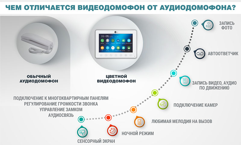 L'indicateur principal caractérisant la fonctionnalité des dispositifs d'interphone, le type d'informations sur le visiteur transmises sur la ligne de communication. Il est présenté dans un format audio standard ou vidéo. Dans le second cas, les coûts d'organisation de la communication directe augmentent de 30 à 50 %. Il existe également des modèles qui transmettent une image sans son sur un canal établi.
