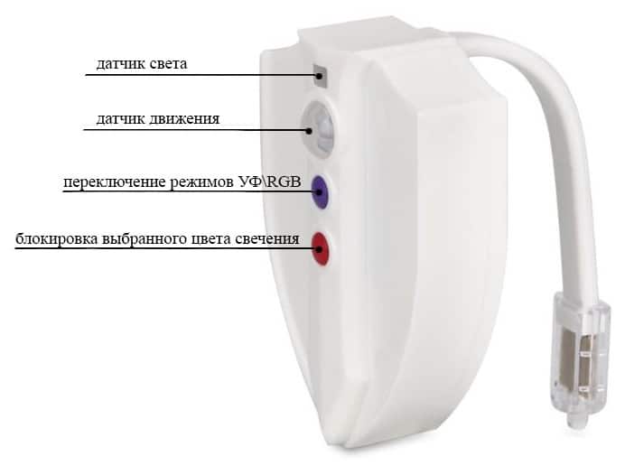Le rétroéclairage d'une cuvette de toilettes avec détecteur de mouvement contient une batterie enfermée dans une boîte en plastique et une bande LED qui y est connectée. De plus, un capteur de lumière ambiante est inclus dans le circuit. Vous pouvez contrôler l'appareil à l'aide des boutons sur le boîtier.