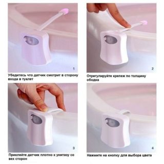 L'appareil est fixé sur le rebord de la cuvette des toilettes. Il se distingue par son design laconique, offrant un confort supplémentaire dans les toilettes. Pour plus de facilité d'utilisation, l'appareil est équipé d'un capteur de mouvement. Une personne n'a pas besoin d'allumer la lumière dans les toilettes la nuit, car la lumière fonctionne automatiquement.