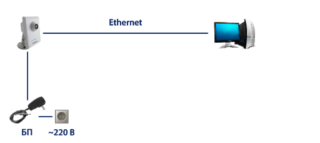 La caméra vidéo est livrée avec un cordon de connexion avec un brochage traversant (cordon de raccordement). Un côté est serti selon le schéma 568A, l'autre - selon 568B. L'extrémité du cordon de raccordement est insérée dans le connecteur RJ-45 et l'autre dans l'ordinateur portable/ordinateur. Une alimentation est connectée à la caméra et branchée sur une prise.