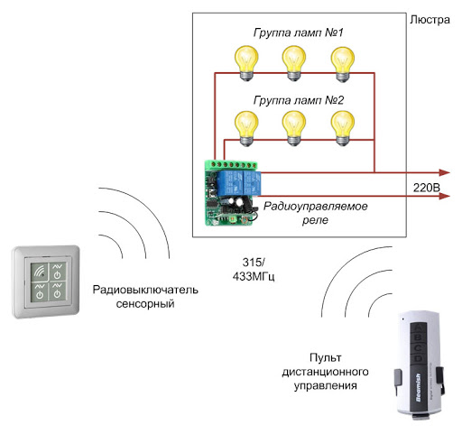 L'ensemble de l'interrupteur intelligent comprend deux dispositifs complémentaires : le récepteur du signal utile et son émetteur. Le premier est un relais miniature contrôlé par un smartphone ou une télécommande. Après avoir reçu le signal de commande, le relais électronique ferme le circuit d'alimentation de l'illuminateur.