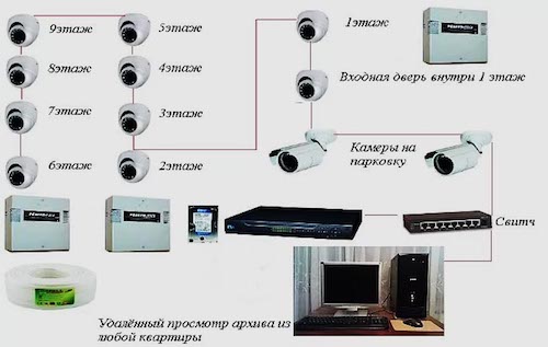 Si vous souhaitez créer et installer un système permettant une surveillance générale, vous aurez besoin d'au moins trois caméras. Le premier enregistre l'entrée et la sortie des personnes des appartements vers l'ascenseur, le second enregistre tous ceux qui entrent dans l'entrée, le troisième affiche l'espace devant la porte d'entrée. Les données des caméras sont affichées sur le moniteur du concierge ou sur l'écran d'ordinateur du responsable de la sécurité de la maison.