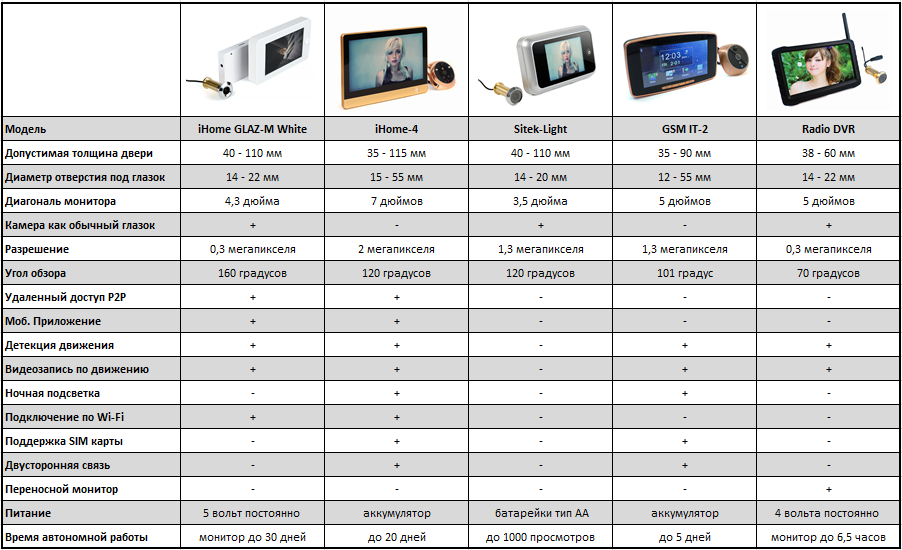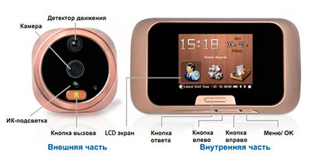 Un simple judas vidéo est placé à l'entrée de l'appartement. L'appareil compact assure la sécurité, prend des photos des visiteurs et les envoie sur le téléphone du propriétaire, est programmé pour communiquer avec plusieurs utilisateurs. Les modèles sont équipés d'un répondeur et connectent le client à l'hôte en son absence via une communication mobile ou des messages au téléphone.