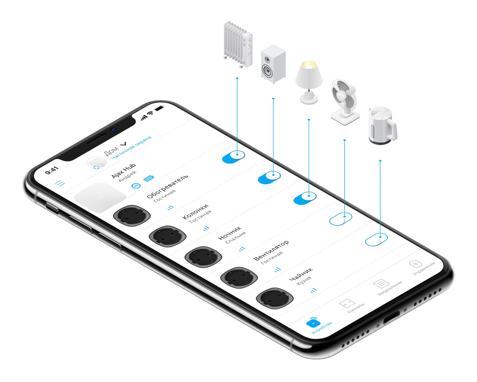 Par leur apparence, ces appareils ne diffèrent pratiquement pas de ceux contrôlés par radio - ils ont également des fiches à broche standard pour se brancher sur une prise ordinaire. Sur le panneau avant, il y a des prises pour le consommateur d'électricité, ainsi que des boutons de commande et des indicateurs sur les éléments semi-conducteurs (LED). Selon l'appareil spécifique, divers capteurs sont inclus dans son kit :