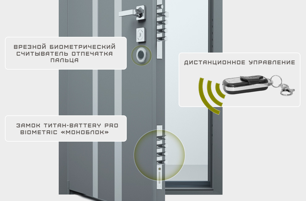 La société Titan produit différents modèles, parmi lesquels il existe des serrures avec un capteur externe installé séparément de la serrure. Les conceptions prévoient un double circuit d'alimentation avec une transition vers une batterie de secours à la fin de la charge de l'élément principal.