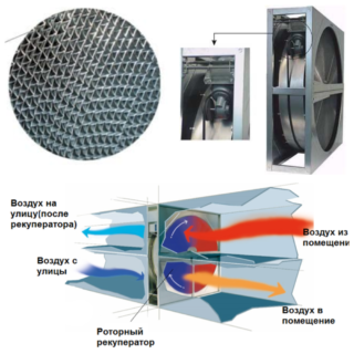 Le récupérateur de chaleur est équipé d'un rotor rotatif. Il transfère la chaleur entre les chemins d'alimentation et d'échappement. La vitesse de conduite détermine les valeurs de récupération. Les appareils ont un rendement élevé (jusqu'à 90 %) et un coût correspondant. Ils sont utilisés dans de grands locaux à des fins industrielles et autres. L'ouverture de la structure augmente la probabilité de transfert d'odeurs de l'air évacué vers l'air entrant.