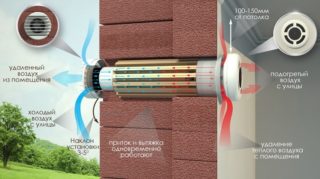 Le principe de fonctionnement du récupérateur est mis en œuvre comme suit : les masses d'air de la rue sont envoyées au bâtiment viabilisé par le conduit de ventilation. Dans l'unité de ventilation, ils sont nettoyés de la poussière, chauffés et pénètrent dans la pièce. L'air vicié des toilettes, des buanderies, de la cuisine passe dans l'appareil et dégage de la chaleur aux masses venant de l'extérieur. L'air vicié est rejeté dans l'environnement extérieur une fois refroidi.