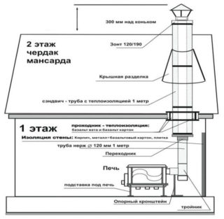 Lors du calcul, il est pris en compte que le tuyau doit dépasser d'au moins 50 cm du bord de la crête et que pour les toits plats, il est nécessaire de retirer plus de 1,5 m du revêtement.
