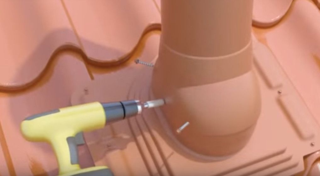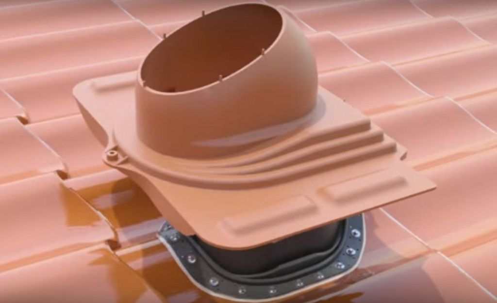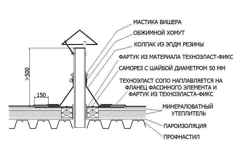 Le nœud même du passage du conduit d'air à travers le toit est fixé dans la zone du tablier. La fixation doit être solide, car le conduit doit résister non seulement aux rafales de vent, mais aussi à la pression de la neige. D'une manière ou d'une autre, sous les latitudes nordiques, une protection supplémentaire est installée pour se protéger de la neige. La fixation de l'assemblage est importante car le jeu provoque l'écrasement du mastic ou du mastic pour éviter les fuites.