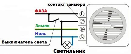 Habituellement, le ventilateur est connecté à l'appareil d'éclairage. Dans ce cas, il commence à travailler simultanément à l'entrée d'une personne dans la salle de bain et se termine après un certain temps défini par la minuterie après avoir éteint la lumière.