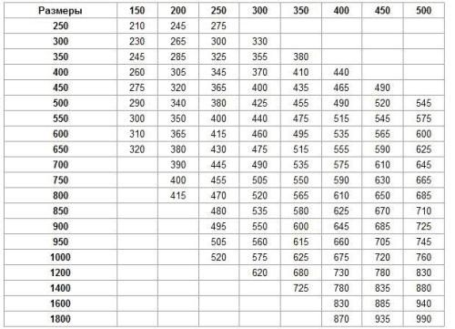 Pour calculer la hauteur de ce tuyau, vous devez connaître son diamètre et disposer d'un tableau spécial. Les cellules des tableaux contiennent les valeurs des sections transversales des conduits et la colonne de gauche indique la largeur des tuyaux. La ligne du haut indique la hauteur du tuyau pour un certain diamètre en millimètres.