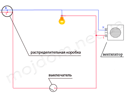 - Dans le cas de l'utilisation de circuits combinés à un luminaire pour alimenter le ventilateur, la source lumineuse doit d'abord être démontée, puis raccordée à ses fils neutre et phase conformément au schéma de principe (noter que le raccordement au fil de phase se fait à la borne située après l'interrupteur). Avec la méthode de connexion du ventilateur que nous avons envisagée, il démarrera au moment où l'éclairage est allumé et cessera de fonctionner après son extinction.