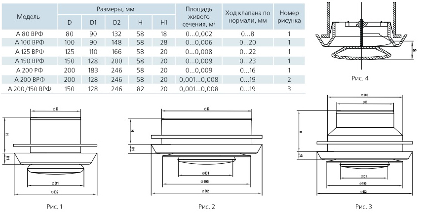Les diffuseurs d'air soufflé de forme rectangulaire sous les désignations A * PR et A * PRF sont produits en deux versions avec des diamètres de 150 et 200 millimètres. La section transversale de ces variétés est de 0,011 et 0,012 mètres carrés, et la course normale de la plaque est de 21 et 22 mm.