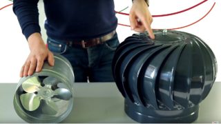Il existe 2 options pour un déflecteur turbo fait maison, qui peut être facilement conçu de vos propres mains. Dans le premier cas, le corps est constitué d'un récipient métallique en forme de cylindre. Les lames sont coupées des murs, elles doivent être pliées vers l'extérieur. Le boîtier est monté sur l'arbre de pivot sans l'utilisation de roulements. La base est constituée d'un morceau de tuyau métallique d'un diamètre approprié. L'unité est fixée à la sortie de ventilation avec une pince. La conception est d'apparence inférieure aux modèles d'usine, elle est donc placée sur des dépendances.