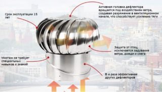 Le déflecteur est une structure aérodynamique qui est montée au-dessus de la cheminée. L'appareil utilise le principe de Bernoulli. L'effet est que la pression statique dans le conduit diminue avec une augmentation de la vitesse de l'air et une modification de la surface transversale du tuyau. Les déflecteurs de turbo ventilés augmentent la poussée et l'efficacité du conduit d'échappement.