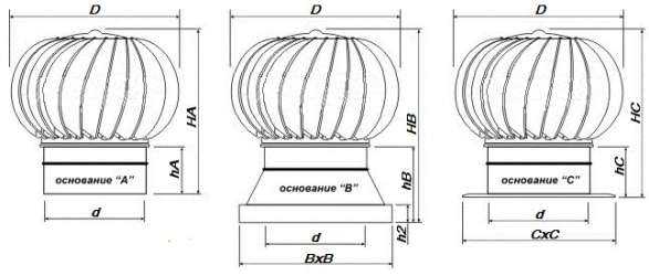Le déflecteur est installé sur la section de sortie du tuyau de ventilation, qui peut avoir une section transversale de différentes formes. Les appareils sont disponibles avec une base ronde et carrée. Il existe des déflecteurs turbo à fond caisson de type transition. Ils sont installés sur des conduits de ventilation en briques ou en blocs.