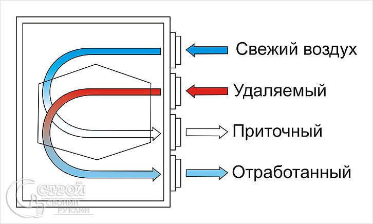 La récupération est un échange de chaleur, et en traduction du latin « retour d'usagé ». Dans la ventilation de soufflage et d'extraction, le récupérateur retire la chaleur de l'air sortant de la pièce et la restitue à l'air soufflé froid. En hiver, la différence entre la température de l'air extrait et l'air fourni à la maison peut atteindre 40 degrés. Habituellement, le chauffage est dû aux appareils de chauffage, c'est-à-dire au portefeuille des résidents de la maison.