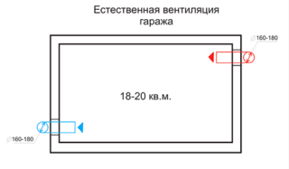 Selon SNIP, afin d'obtenir un système de ventilation efficace dans le garage, il faudra organiser la circulation naturelle des masses d'air. Ceci peut être réalisé grâce à la différence de température toujours existante entre l'environnement intérieur et extérieur. Pour obtenir l'effet souhaité, deux trous de ventilation sont pratiqués dans les murs du bâtiment du garage, décalés en hauteur de la distance maximale possible. L'un d'eux sera l'entrée et le second sera la sortie.