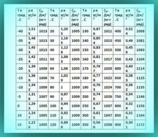 Pour le calcul correct de l'aérotherme, il est nécessaire de déterminer les données initiales : performance, densité de l'air, rue et température ambiante souhaitée. Ces derniers indicateurs sont extrêmement importants, car la quantité de chaleur dépensée pour chauffer 1 m3 d'air en dépend. Certaines données peuvent être trouvées dans des tableaux spéciaux.
