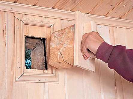 L'entrée se fait plus près du sol, en plaçant l'extrémité du conduit au fond du foyer, à une distance de plusieurs centimètres de la tôle qui protège le sol du feu. La ventilation d'alimentation dans le hammam fonctionnera grâce aux conduits de ventilation de la fournaise et au conduit d'air d'alimentation. La sortie d'échappement est idéalement placée sur le mur opposé, à 30 cm du plafond. Il est recommandé de faire un autre trou sous les étagères. Les deux trous doivent être reliés à un conduit vertical. Le capot inférieur est légèrement ouvert lors de la prise de procédures dans le hammam, le capot supérieur est fermé à ce moment. C'est un tel système qui permettra d'économiser de la chaleur et en même temps de fournir une ventilation.