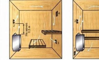 Un tel système est très efficace, rentable et fonctionne grâce à la différence de température et de pression atmosphérique. L'emplacement des trous est déterminé en fonction de la taille du hammam et du lieu d'installation du poêle, des étagères, du matériau des parois du bain. Selon les règles générales, l'arrivée dans le bain se fait par le bas et la hotte se fait par le haut.