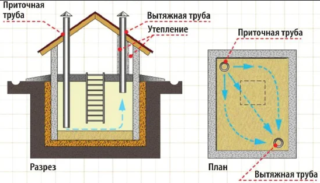 Le trou pour la cheminée est fait directement sous le plafond, car l'air chaud et gazé monte et aucune stagnation ne s'y forme. Afin d'obtenir un bon tirage, le tuyau de ventilation de sortie s'élève le plus haut possible (au-dessus du faîte ou au-dessus du remblai du plafond de la cave d'au moins 150 cm). Pour cette partie du circuit de ventilation, des tuyaux en plastique typiques utilisés dans l'agencement des systèmes d'égouts sont sélectionnés.