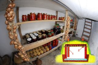 Dans l'espace intérieur du sous-sol, des volets de conception spéciale sont montés dans chaque branche du conduit d'air, s'ouvrant ou se fermant dont il est possible de modifier l'intensité des flux d'air. Cela garantit la création du microclimat nécessaire au stockage à long terme des ustensiles ménagers et des conserves.