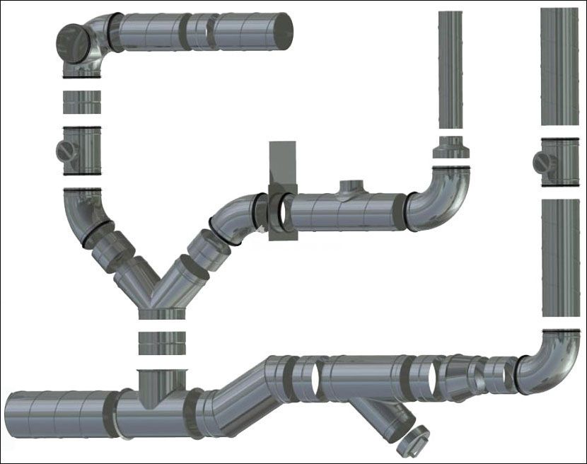 Les coudes sont assemblés à partir de segments séparés, fixés les uns aux autres avec une connexion de verrouillage. Leur taille et leur nombre sont déterminés par l'angle de rotation. Les coudes avec les plus petits diamètres sont réalisés par emboutissage.