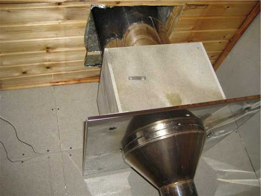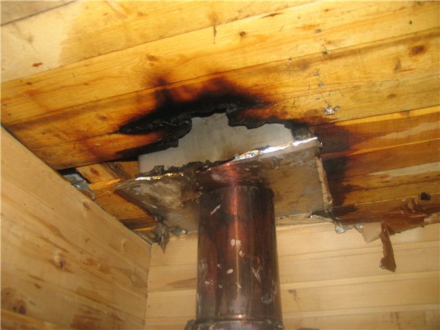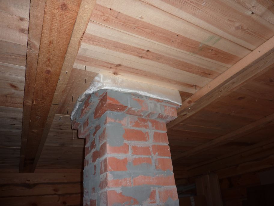 Il est également nécessaire d'aménager le passage de la cheminée à travers le plafond si le tuyau n'a pas de contact direct avec les structures en bois du bâtiment. Les températures de fonctionnement de ses murs extérieurs atteignent des valeurs suffisantes pour commencer la carbonisation et la combustion lente ultérieure des zones adjacentes. Cela oblige à protéger les éléments du passage au moyen d'une classe d'isolation NG.