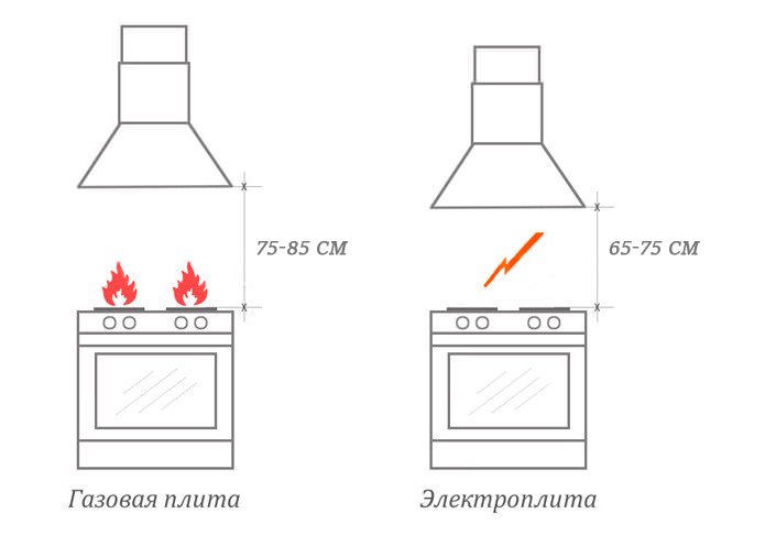 La distance entre le poêle et le corps de toute hotte est déterminée par une seule norme. Lorsqu'une cuisinière électrique typique est utilisée dans la cuisine, dans le cas général, la structure d'échappement n'est située ni plus haut ni plus bas que 65-75 cm de celle-ci. Si la hotte est suspendue directement au-dessus de la cuisinière à gaz, la distance entre elles devra être augmentée à 75-85 cm.Dans une situation où la hotte est montée avec une surface inclinée, les paramètres d'installation ne changent que vers le bas. Dans ce cas, les restrictions de placement ressemblent à ceci :
