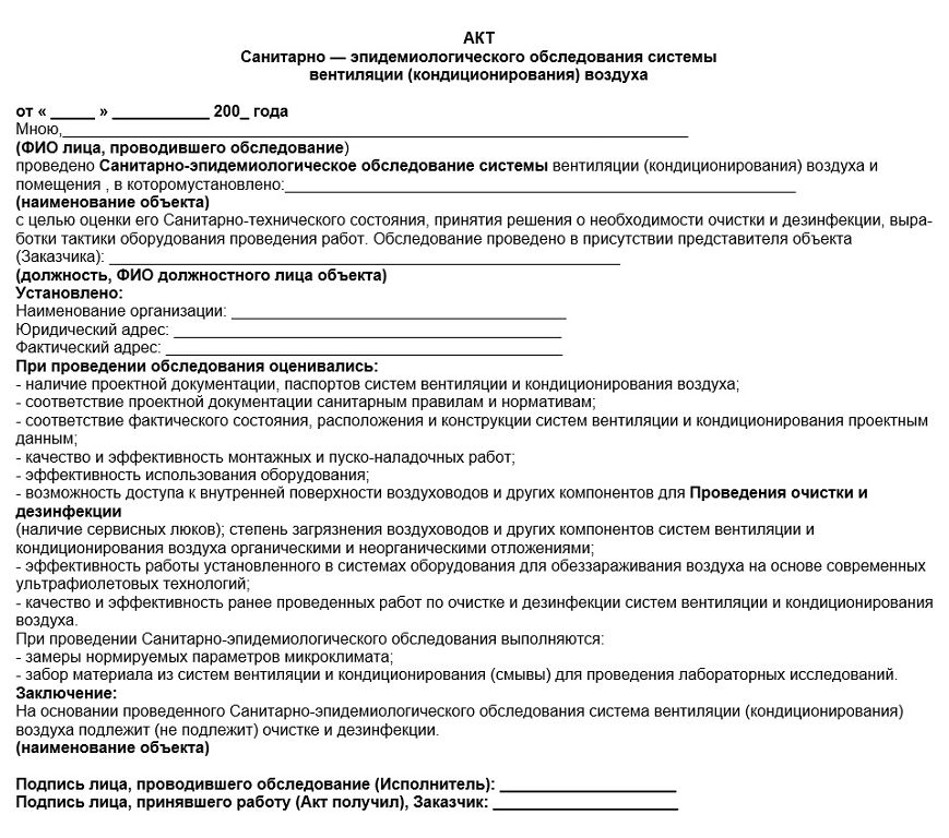 Au cours des examens sanitaires et épidémiologiques du système de ventilation, les données suivantes sont saisies dans l'acte: