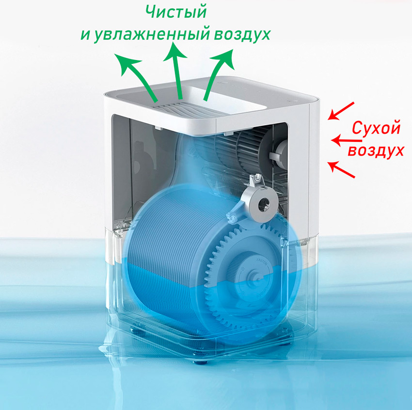 Le principe de fonctionnement de l'humidificateur consiste en un pompage forcé de masses d'air par un ventilateur à travers un filtre à eau et une évaporation de l'eau. Dans les appareils traditionnels, le liquide s'évapore naturellement, dans les appareils à ultrasons, un brouillard d'eau se forme, produit par l'action des ultrasons, dans les appareils à vapeur, à vapeur chaude.