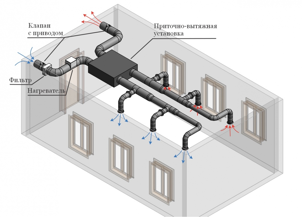 L'échange d'air dans le bâtiment est organisé de manière à ce qu'une personne puisse contrôler la ventilation. La ventilation signifie l'apport simultané d'oxygène et l'évacuation de l'air évacué et est divisée en systèmes d'alimentation et d'évacuation.