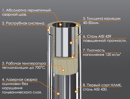 De tels tuyaux conviennent aux cheminées et à la ventilation extérieure, qui, selon les exigences du contrôle technique, doivent être isolées. Les tuyaux sandwich sont connectés les uns aux autres à l'aide d'une méthode en forme de cloche. Le coût d'un tuyau sandwich en acier inoxydable est 1 \ 2 plus élevé qu'un tuyau combiné.