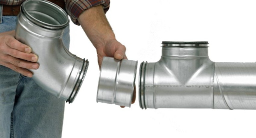 La méthode du goujon et du profil est utilisée pour différentes sections. Deux parties bouclées sont placées sur les côtés du conduit de ventilation et vissées avec des vis autotaraudeuses. D'un côté, il y a un trou pour la connexion avec un goujon, qui est doublé d'un joint en caoutchouc pour réduire le bruit et les vibrations.