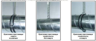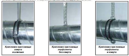 La méthode des goujons et pinces est utilisée pour fixer une canalisation circulaire. Les fixations sont disponibles en différentes tailles et ont des joints en caoutchouc à l'intérieur pour réduire les vibrations. Une épingle à cheveux avec une pince est fixée au plafond avec une ancre en métal ou une cheville en plastique (canaux de petite taille). Le bas du support est retiré, le tuyau de ventilation est installé, puis le collier est resserré.